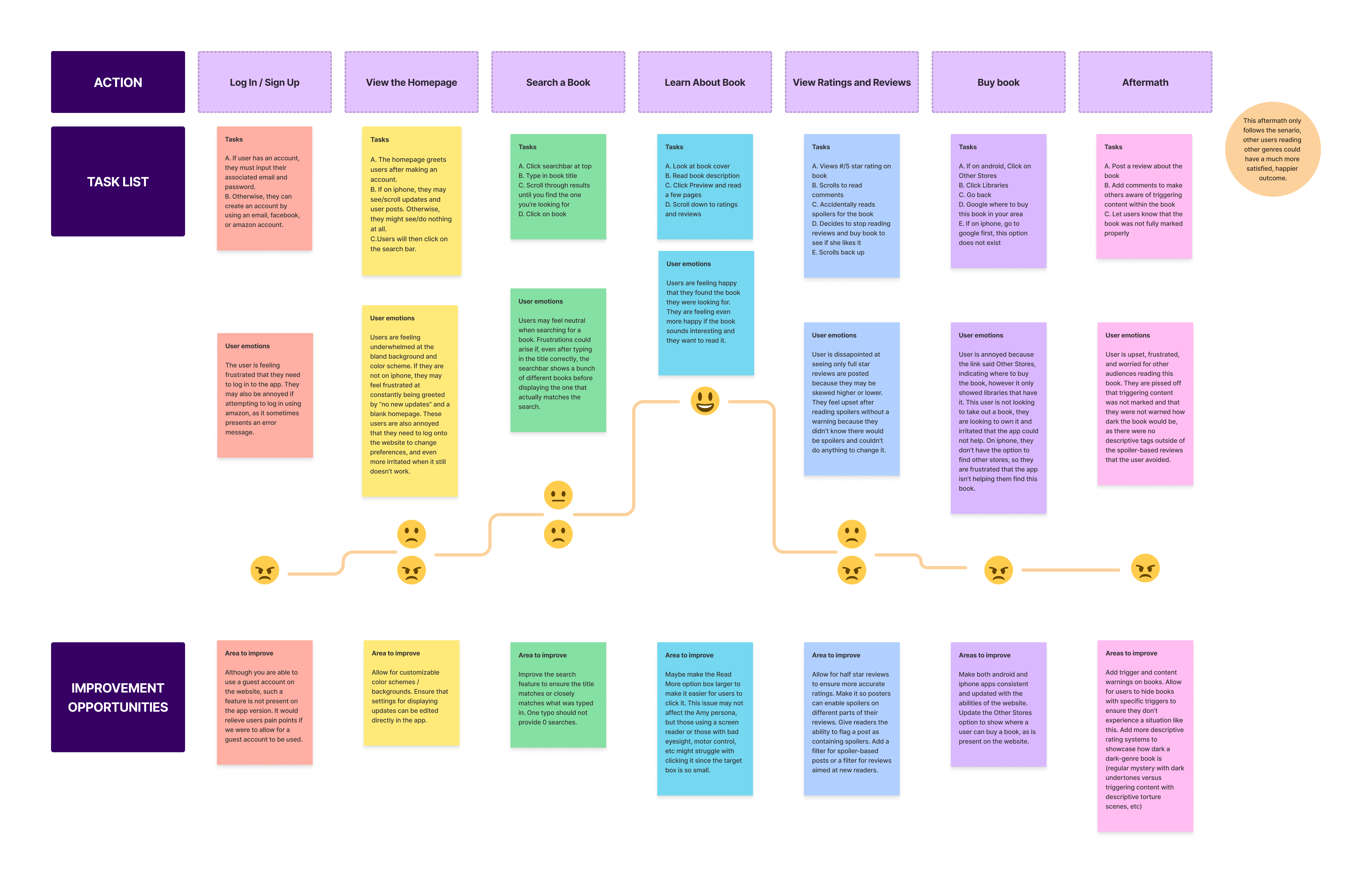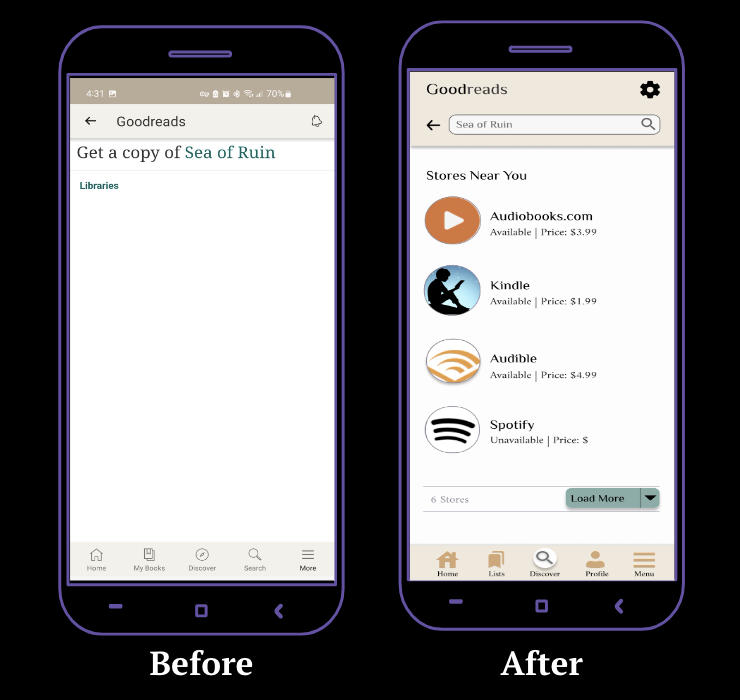 Through this project, I was able to conduct in-depth user interviews, collect data, create user flows, empathize using journey mapping, compile information architecture through a site map, and iterate on my designs to form an accessible and usable interface for Goodreads' book page.