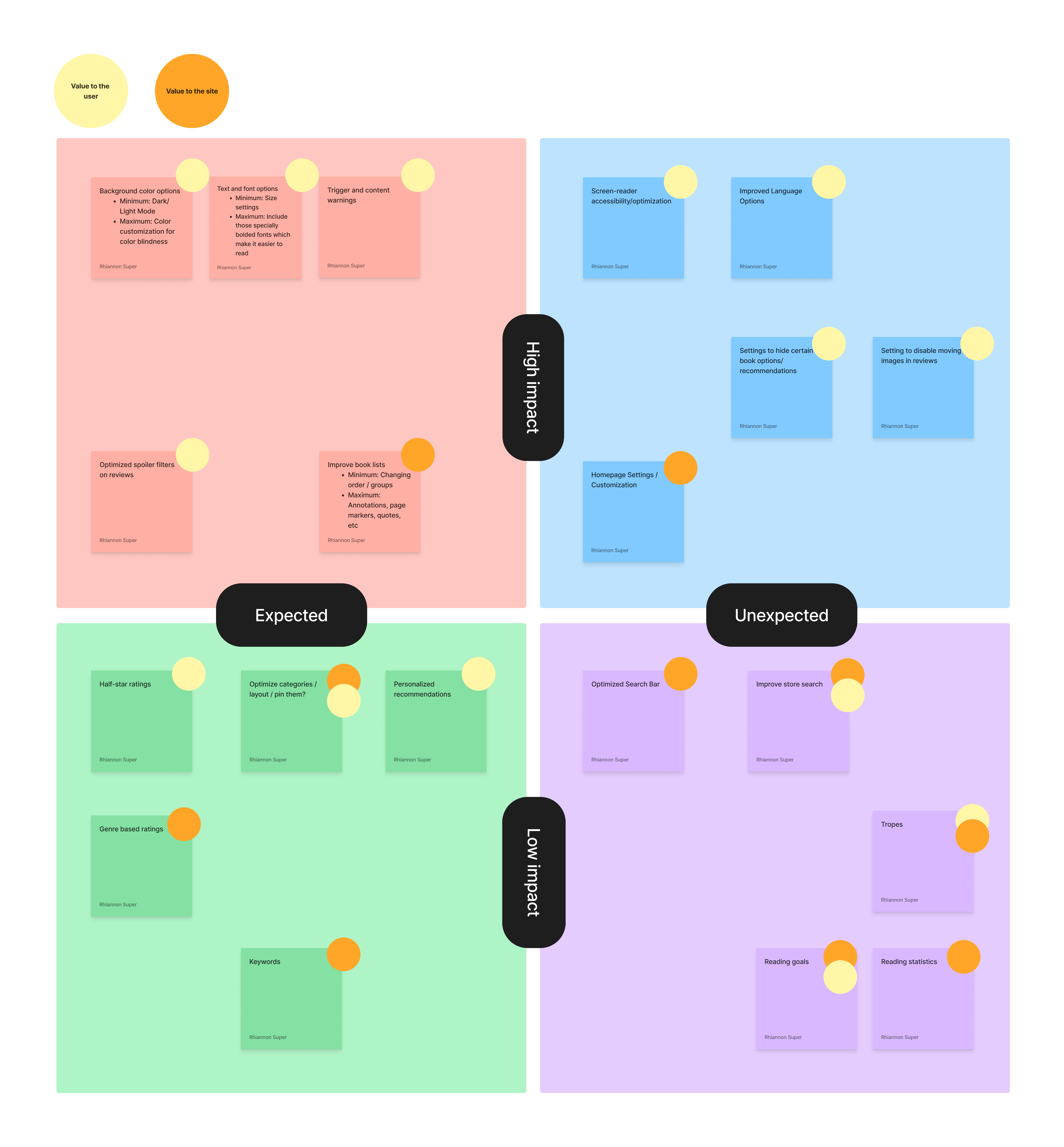 After brainstorming different ways to achieve user needs and goals, a list of potential app features was created. By utilizing a 2x2 matrix, these features were sorted based on relevency and impact.