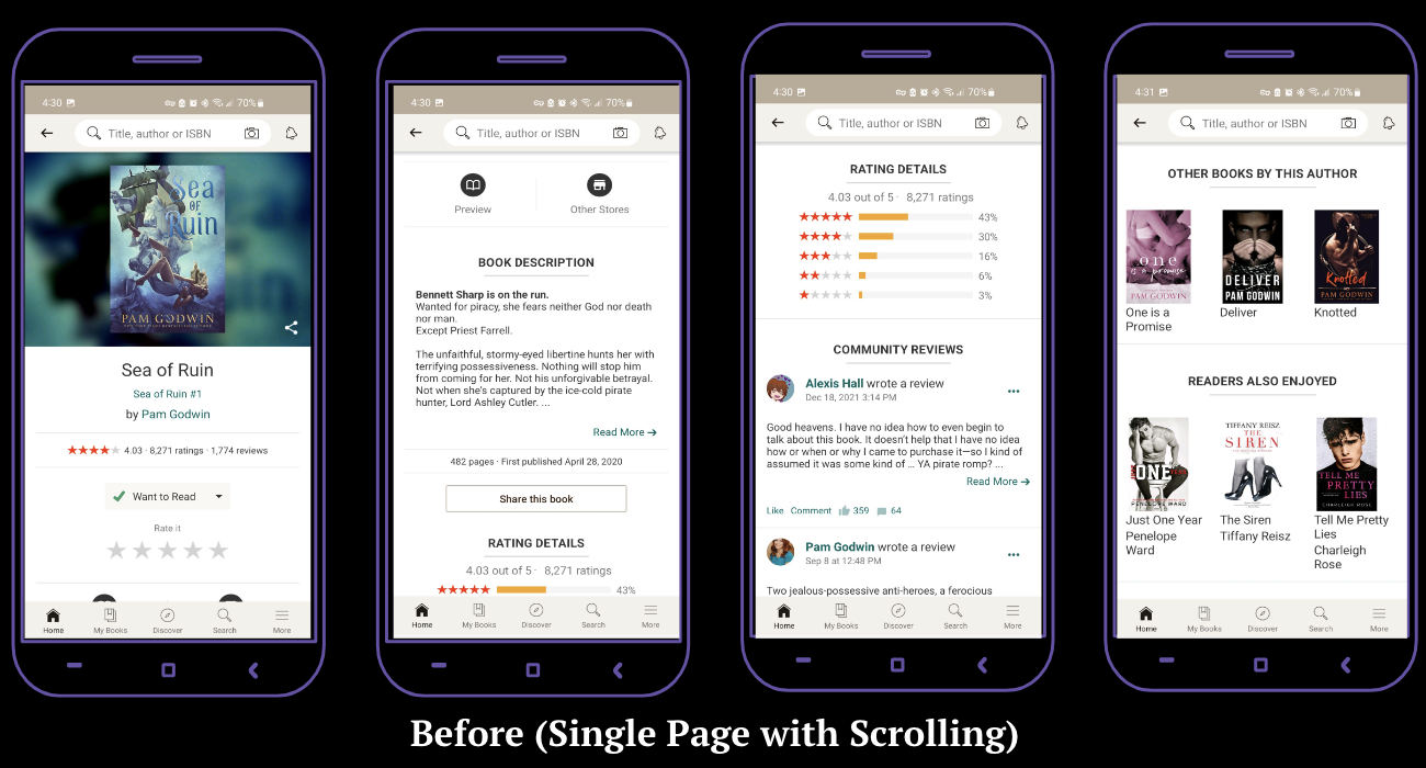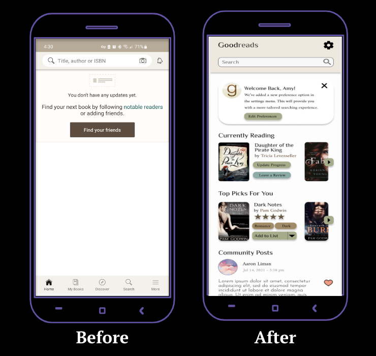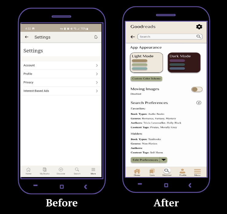 Despite being the largest site for readers, the app has not been updated in some time, as shown through the outdated interface and lack of accessibility considerations for users with sensory processing disorders, trauma disorders, and screenreaders.